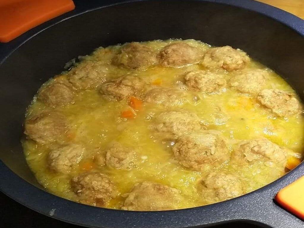 - Cuando la cebolla y el puerro esté bien pochado agrega el vaso de vino, sube el fuego y déjalo reducir un par de minutos. Añade el contenido del cazo y cuando comience a hervir incorporamos las albóndigas y comprobamos de sal y pimienta. Deja cocer unos diez (10′) minutos, verás que las albóndigas crecerán al absorber parte de la salsa.